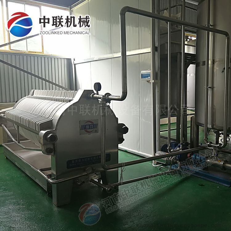 注入额定用水量的60%的纯净水加热到80%,将萃取液和完成糖浆分别加入,同时开启搅拌。3 .板框过滤机
